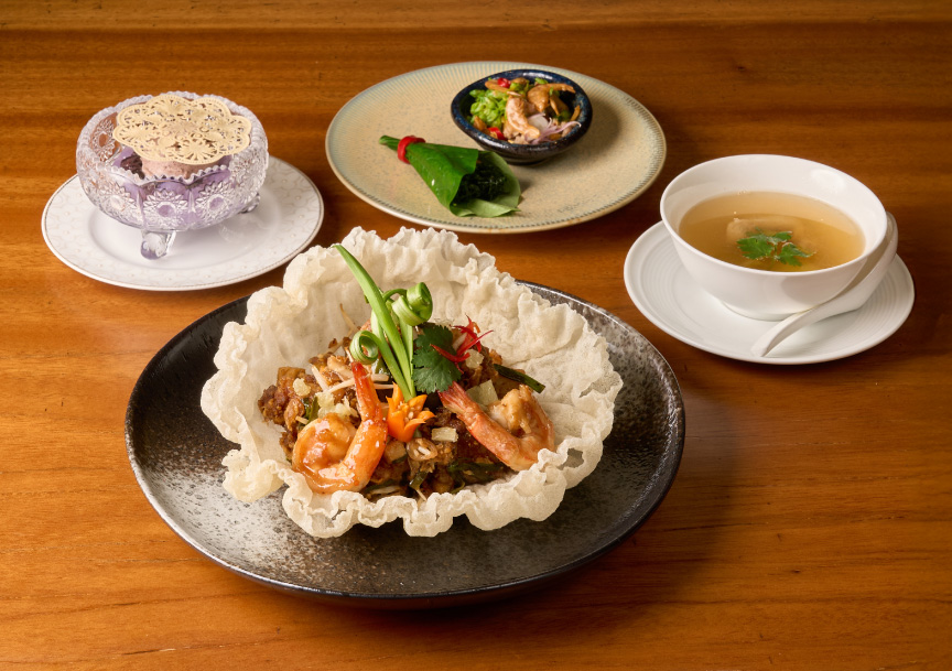 Kaeng Run Juan is an authentic Thai dish first recorded in the time of King Rama V. Leftover shrimp paste sauce is used to make this dish. Saneh Jaan select fine ingredients to create this delicious menu and serve with hot steamed rice.