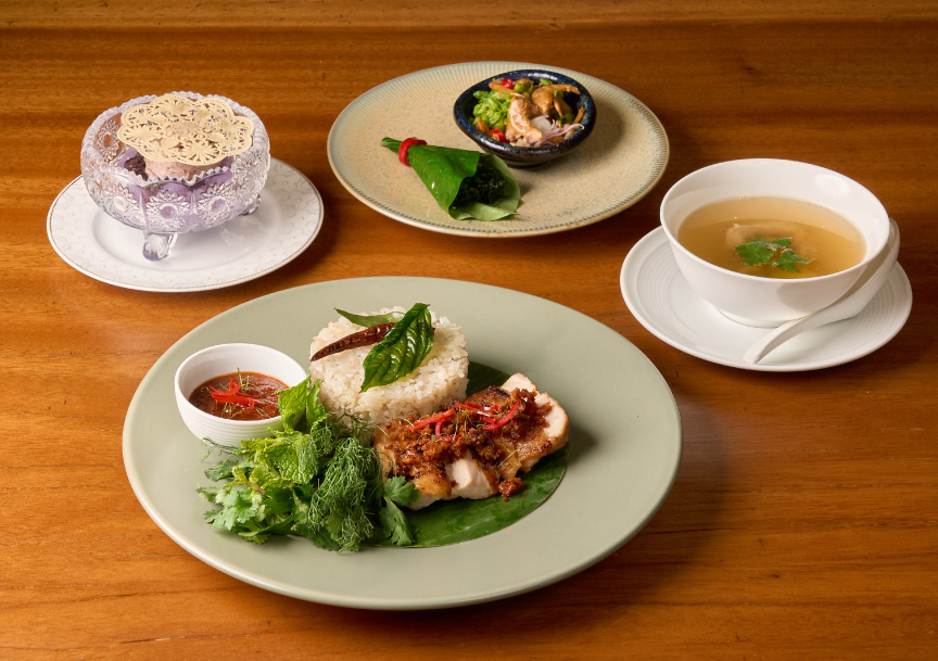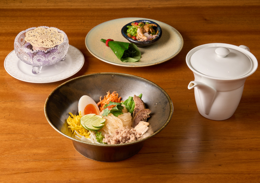 ก๋วยเตี๋ยวสุโขทัยSukhothai noodle soup with pork and a sweet–tangy broth toppedwith fresh herbs and peanutsDesserts