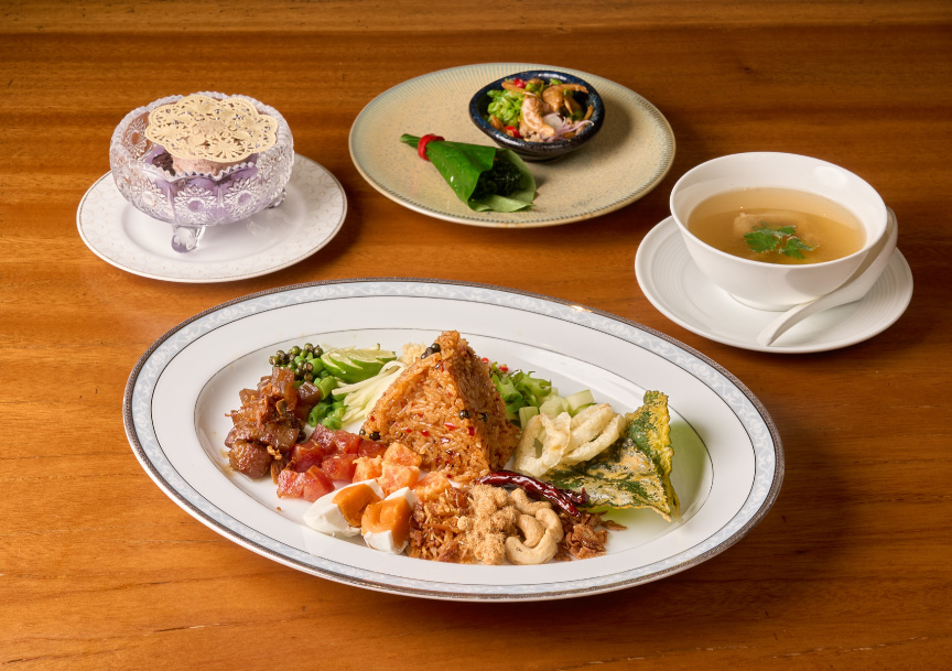 ข้าวคลุกสำรับใหญ่Thai rice platter served with a variety of traditional condimentsTraditional Thai radish cake with grilled prawn